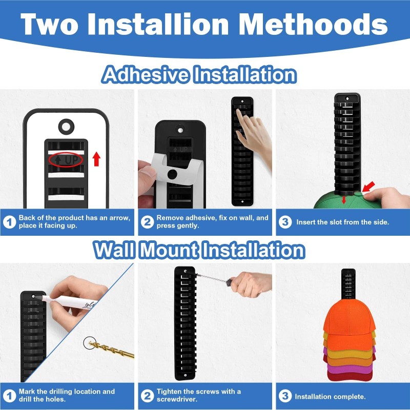 - Two installation methods: Our hat storage for baseball caps can be installed using two methods: self-adhesive and screw drilling. You can choose the appropriate method according to the usage scenario. NOTE: Either way, with the arrow on the back, please place it facing up. Since the adhesive is very strong, place the hat organizer for wall on a surface that will not tear.