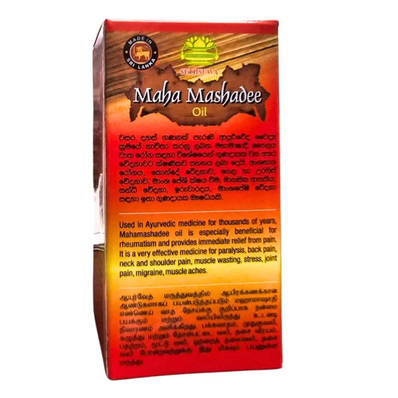 Introducing Maha Mashadee Oil, your comprehensive solution for all types of pain. This potent formula, housed in a convenient 60ml bottle, targets back pain, muscle pain, body pain, and joint pain with remarkable efficacy. Crafted from a powerful blend of natural ingredients, it penetrates deep into the affected areas, providing fast and effective relief. Whether you're dealing with a stubborn backache or sore muscles after a workout, Maha Mashadee Oil offers soothing comfort and freedom from pain, allowing you to get back to living life to the fullest. Maha Mashadee Oil stands as your go-to remedy for diverse pains, offering targeted relief in a compact 60ml bottle. Harnessing the potency of natural ingredients, it addresses back pain, muscle pain, body pain, and joint pain effectively. Its deep-penetrating formula ensures swift alleviation, enabling you to bid farewell to discomfort and embrace life unhindered. Trust Maha Mashadee Oil to provide the soothing comfort and relief you need, empowering you to move with ease and enjoy every moment pain-free.