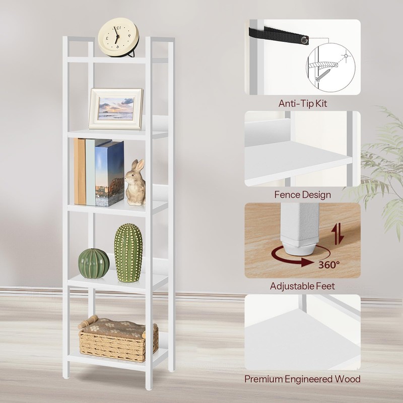 - Large-Capacity Storage: The 5-tier bookshelf easily accommodates books, photo frames, ornaments, and various daily necessities, while its compact size and flexible placement options enable you to create a tidy and organized living space