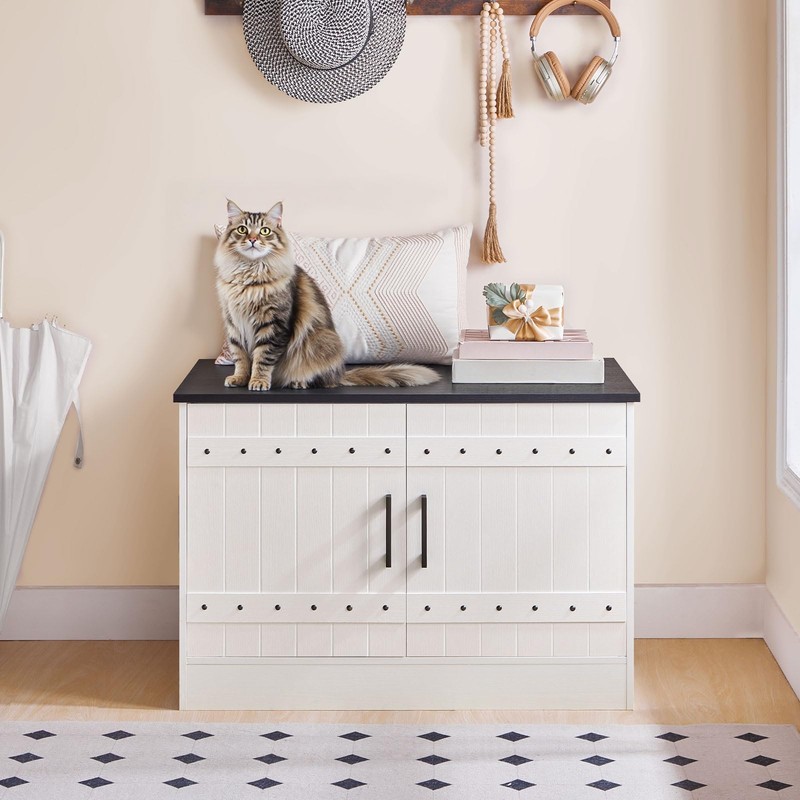 - Farmhouse Aesthetic: Featuring a rustic design with unique decorative details, the cat litter box furniture seamlessly blends with various home decor while providing a private space for your feline friend and preventing dogs from entering and disturbing