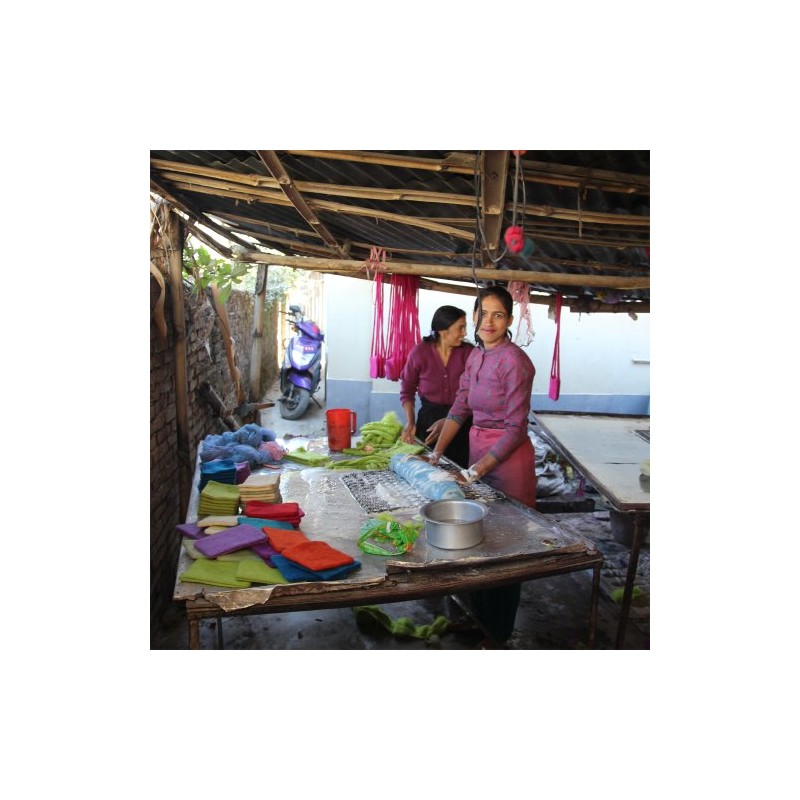A women's cooperative (Fairtrade) from Nepal makes this anthracite-coloured, versatile eye-catcher for the table made of pure wool. They are heat resistant and tested. (Photo of the craftswomen during our visit site).