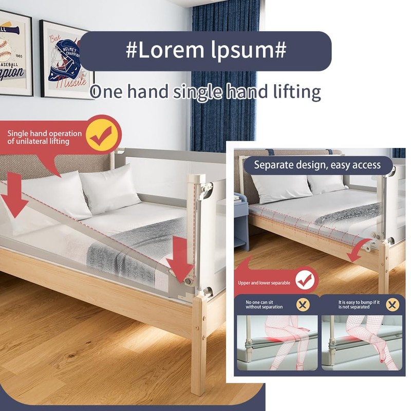 - 【Independent Vertical Lifting】Different from other swing-down safety bed guards, ours features vertical lifting design which won’t be stuck by the nightstand. Even better, each side can be lowered or lifted independently, making it easier for kids to get in and out of bed. The double-lock system is designed to prevent baby from accidentally pressing the lifting button.
