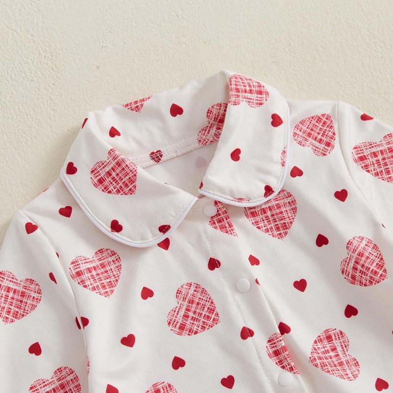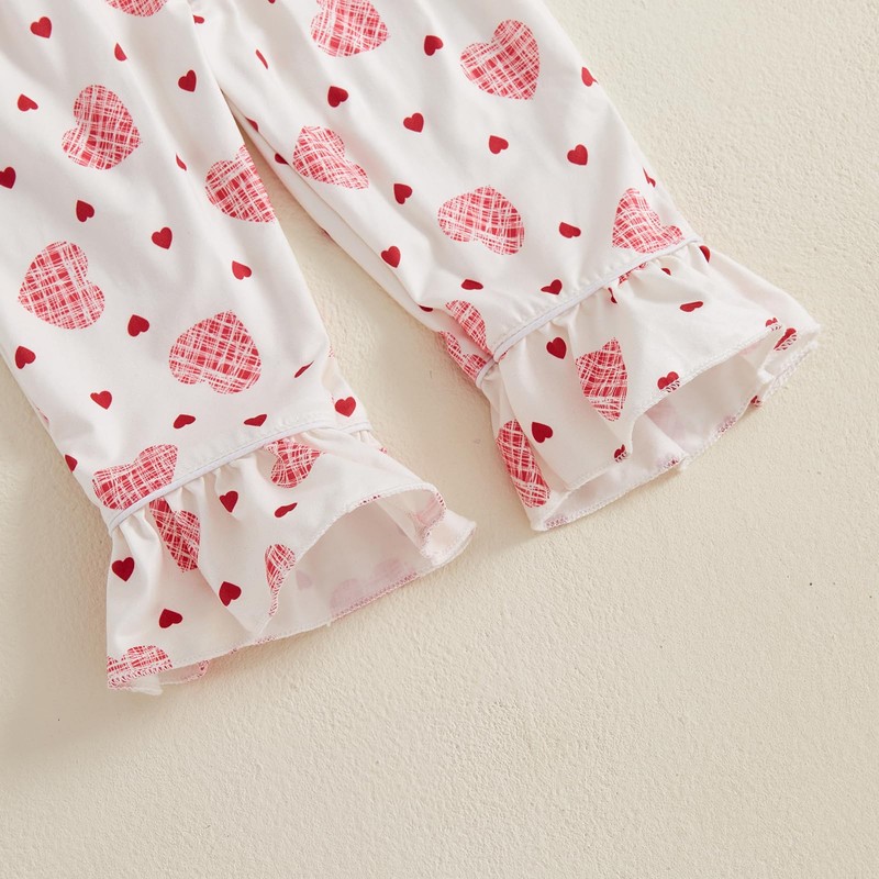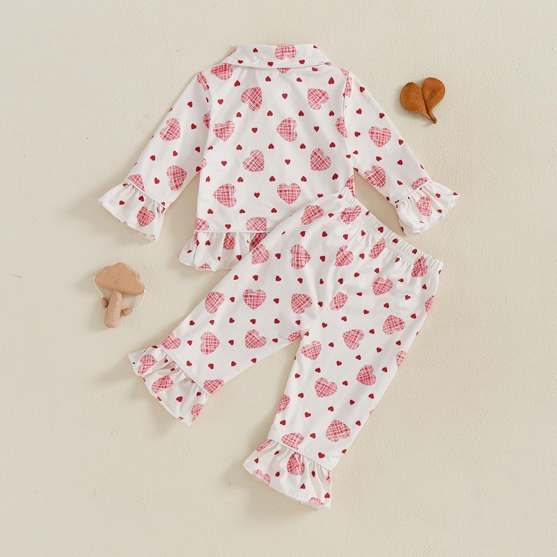 Toddler girls pajamas, romantic heart print with ruffles; Pajama top with long sleeves, front button closure and lapel; Pajama pants with elastic waist design, easy to fit, warm and cozy