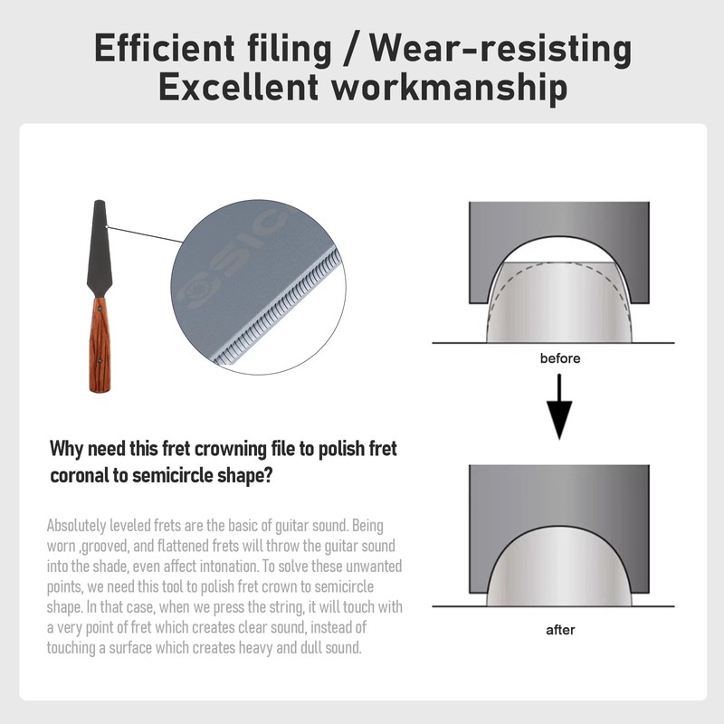 - 1.Why you need our this fret crowning file to polish guitars fret?Because it is basic for guitar to have leveled frets for perfect sound. When frets are worn ,grooved, and flattened, it will throw the guitar sound into the shade, even affect intonation. To avoid these unwanted points, you need this tool to polish frets crown into semicircle shape. In this way, when you press the string, you will touch with a sharp point of frets, which creates clear sound.Instead, touching a surface which creat