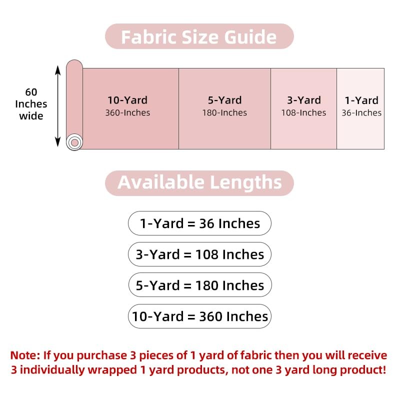 - Size:1 Yard-36*60inch,3 Yards-108*60inch,5 Yards-180*60inch,10 Yards-360*60inch. Each yardage is a separate piece. For example, if you select 5 yards and the quantity is 2, you will receive 2 separate pieces of 5 yards of fabric