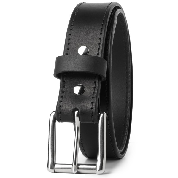 - Rock Your Style with Confidence While Buying American! This one piece solid mens black leather belt is handmade in the USA of Full Grain American cowhide leather. Available in multiple styles to ensure we have an option for you everyday: jeans, casual, work or dress we have you covered.