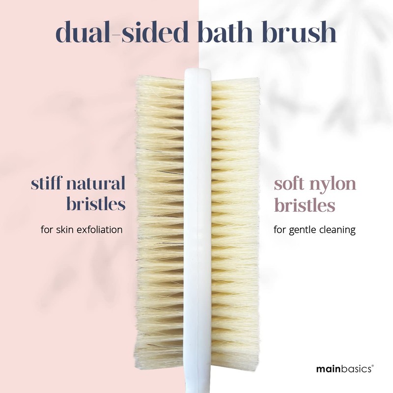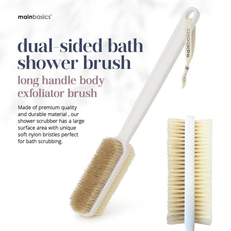 MainBasics Shower Brush Back Scrubber Dual-Sided Body Brush Long Handle with Soft and Stiff Bristles for Dry & Wet Brushing (White)