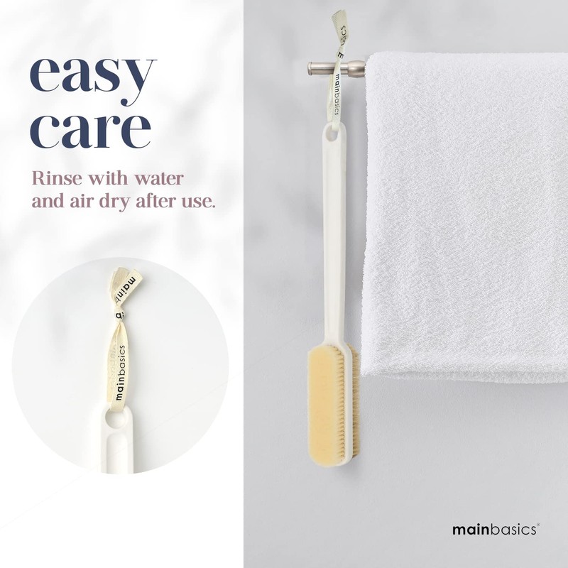 - Durable – Say goodbye to yucky scrubbers. The MainBasics' Shower Back Brush has a plastic handle. It's sturdy and lightweight with an extra long and large bristle surface area that makes scrubbing a breeze.