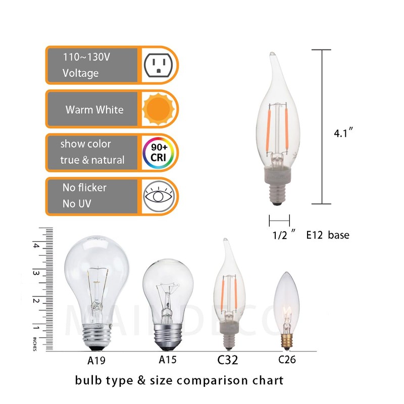 - Widely Application:E12 standard base,Comfortable and relaxing 2700K soft light,as chandelier light bulb,candle light bulbs,led filament bulb,Ceiling fan light bulb,Wall Scorce light bulb,Decorative light bulb for Kitchens,Living Rooms,Dining Rooms,Bedrooms,Hallways,Bedside lamp,etc.