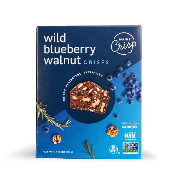 Indulge in a light, crunchy and savory-sweet crisp. Made with naturally gluten-free buckwheat flecked with wild blueberries, California walnuts, and rosemary. These will be your newest obsession! Manufactured in a dedicated gluten-free facility. Created with buckwheat flour and all-natural ingredients to give you the best gluten-free snack crisp. Who says cheese and charcuterie get all the fun? Nothing more delightful than an assorted charcuterie board with your favorite cheese crackers! We promise it’ll be the best part. These aren't just for your cheese board. Our Wild Blueberry Crisps also make great dipping crackers for guacamole, baba ganoush and more. Even use them as a salad topping! Maine Crisps are made in good spirit, from the best possible natural ingredients, responsibly farmed. Available in three other flavors -- Cranberry Almond, Savory Fig & Thyme and Cinnamon Maple. Want to try them all? Our variety pack has you covered! CONTAINS: MILK AND WALNUTS Made in a facility that uses Milk, Almonds, Pecans,and Coconut. May contain shell fragments. Manufactured in a dedicated gluten-free facility. No preservatives, nothing artificial, no gums.