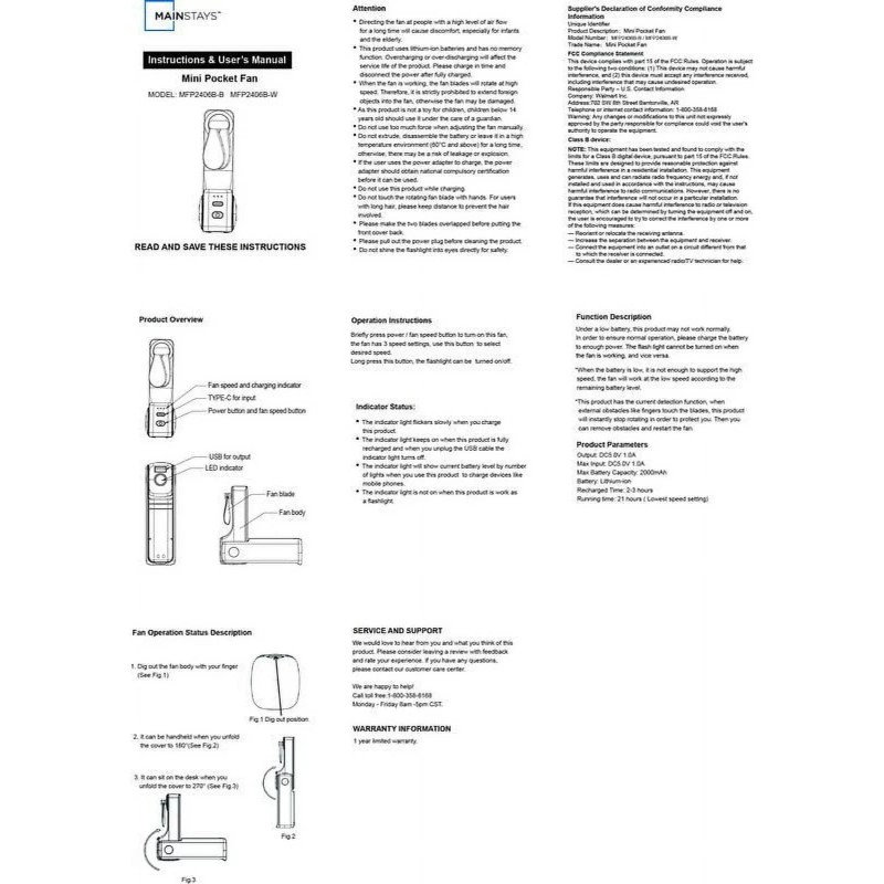 MAINSTAYS 3 in 1 Personal Fan, USB Rechargeable with Power Bank Function Black