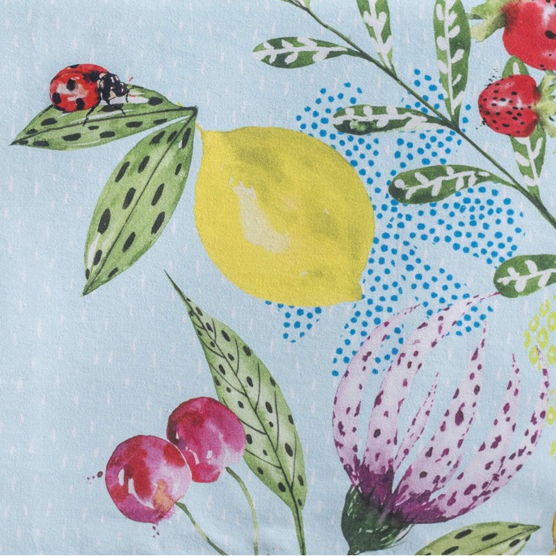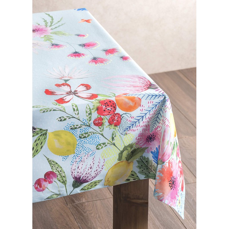 - PACKAGE INCLUDES: 1 Rectangle Tablecloth measures 140 cm by 230 cm. With all those blossoms, fruits and insects artistically baked into a spring-friendly style, the tablecloth uses a brilliant combination of muted pastels and soft color tones. Made from 100% cotton, the tablecloth is available in two colorways. One with a beige background and other with a turquoise background.