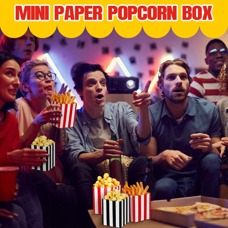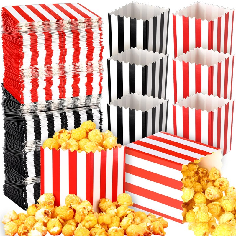 - Suitable Size: the package contains 100 red and white striped popcorn boxes and 100 black and white striped popcorn boxes; Each disposable mini popcorn box measures 3 x 3 x 3.9 inch/7.6x7.6x10cm, these adorable red and white striped boxes are suitable for serving popcorn, candies, and other sized snacks; The size is suitable to meet your various needs, convenient for storing or taking out snacks, and suitable for sharing and celebrating with friends