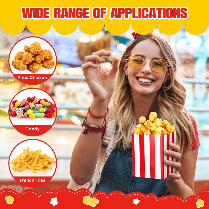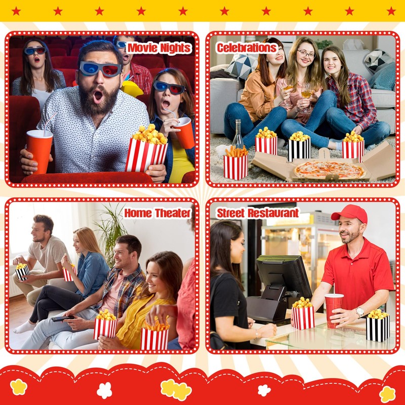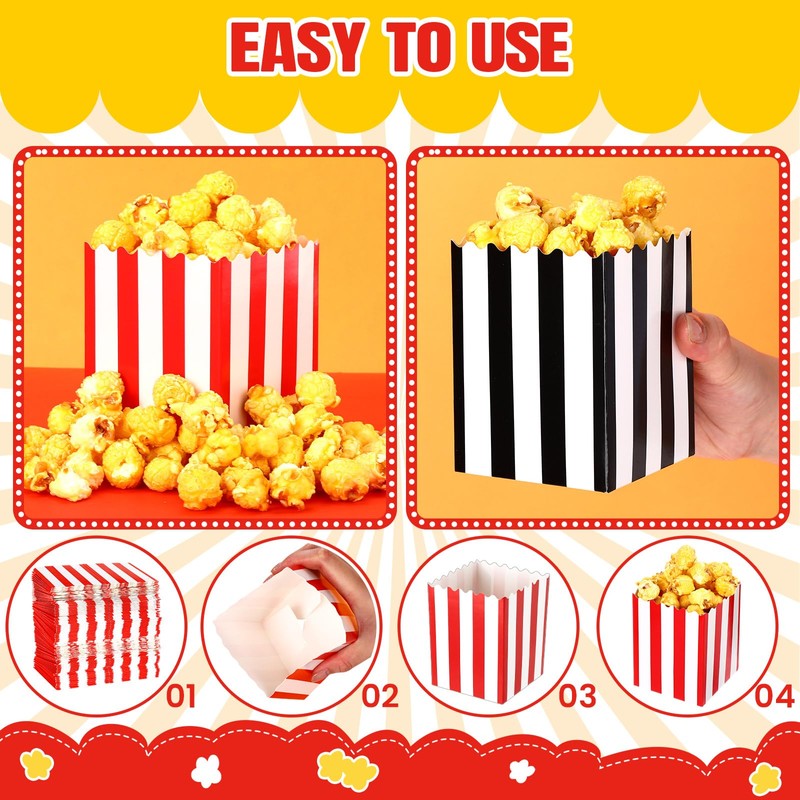 - Easy to Use: this movie theater popcorn box is quick and easy to assemble, without the need for expertise and special tools; It can be folded for storage, so you can take it at any time; It can be directly discarded after use without washing, especially suitable for large occasions such as gatherings, parties or festivals; If you want the popcorn box to be more secure, you can also seal the bottom with tape