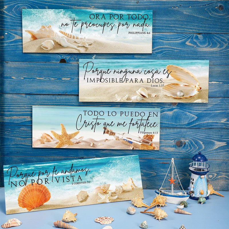 Maitys 4 Pcs Beach Bible Verses Wall Decor in Spanish Christian Gifts Inspirational Wooden Religious Wall Art Spanish Scripture Coastal Seashell Starfish Sign for Farmhouse Bathroom Kitchen Room
