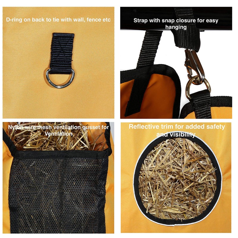 - Reinforced Resilience for Animals – We use a heavy-duty 1200 D Nylon with ultra-strong stitching for durability, reflective trim for added safety and visibility and Tough Nylon wire mess gusset for ventilation and to keep to your Hay dry.