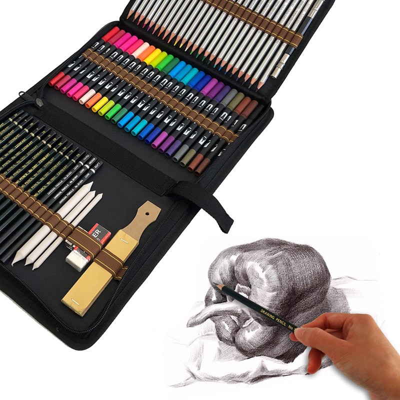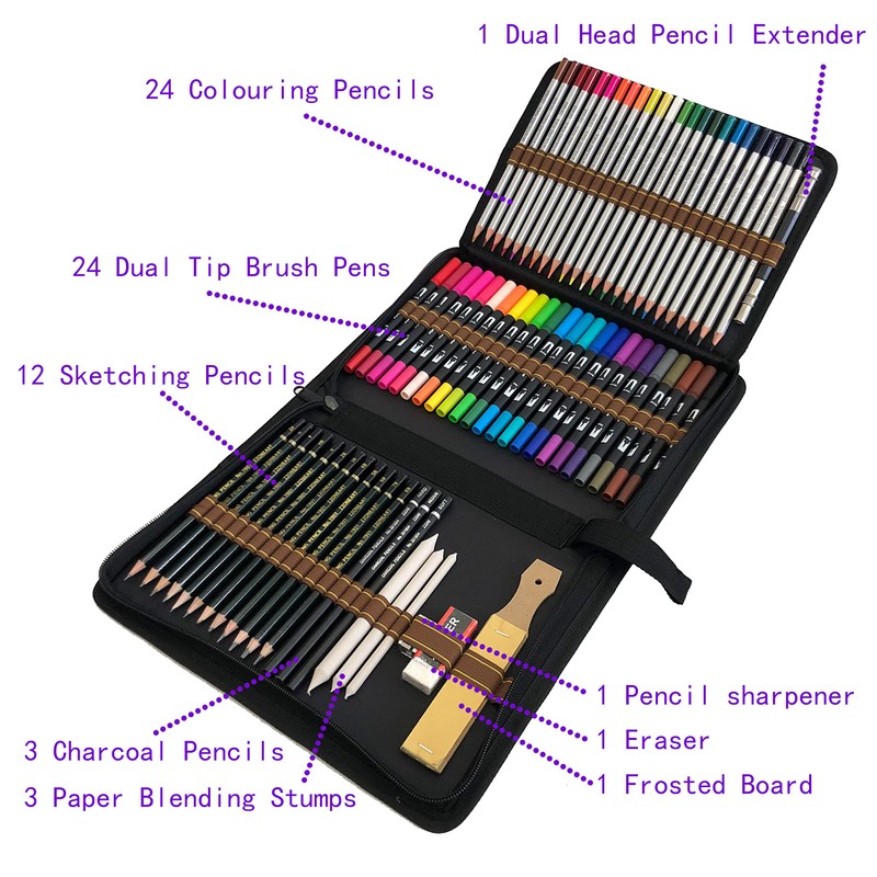 • 1.Complete Drawing Pencils Set: Package has 71 pieces, include 24 Colouring Pencils,24 Coloring Pens Dual Brush Pens,12 x Drawing Pencils,3 charcoal pencils,1 pencil extender,1 eraser ,3 blending paper stumps,1 sandpaper,70packs in total.