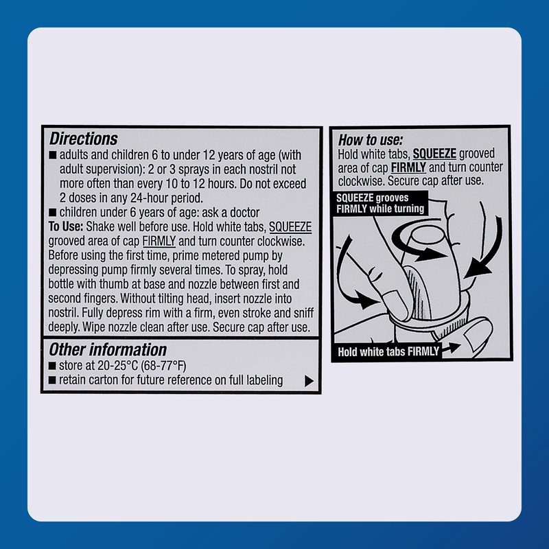 - HOW TO USE: Shake well before use. Spray 2 to 3 sprays in each nostril no more often than every 10 to 12 hours. Do not exceed 2 doses in any 24-hour period or use for more than 3 days. Prolonged use may cause nasal congestion to recur or worsen.