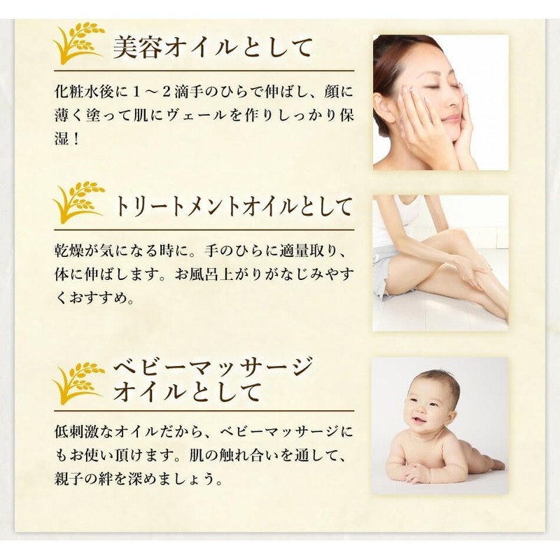 - (For Moisturizing Skin with Daily Care) We incorporate rice bran oil into daily skin care and body care to create moisturizing skin. As a beauty oil: After lotion, spread 1 to 2 drops in your palm of your hand, apply a thin coat on your face to create a veil on your skin to keep it moisturized. As a treatment oil... For when you are concerned about drying. Apply an appropriate amount to the palm of the palm and stretch it to your body. We recommend it to be easy to get in the bath. As a baby massage oil: Because it is hypoallergenic oil, it can also be used for baby massage. Deepen the bond between parents and children through skin interaction