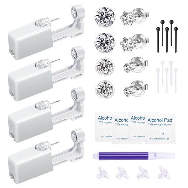 - [SET INCLUDES]: 4 ear piercing guns, (pre-installed in the ear piercing gun, six-clawed cubic zirconia + round cubic zirconia 2 pieces each), marker pen, 4pcs alcohol cotton, 4pcs Frisbee high-permeability silicone earring backing, 10pcs ball ear piercing stick, one-stop complete without the need to buy other accessories, and at the same time to meet the conditions of anytime and anywhere to play the piercing of the ear, for the beauty of the extra points.