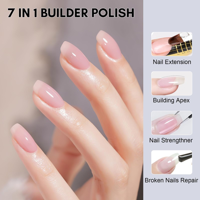 - 【Gel Builder for Nails】The builder can be used as a nail builder for Extension, gel shaper forbuilding gel nail apex, clear gel nail polish,nail strengthener, and gel color sealer. The moderate thickness and self-leveling make it easy to manipulate, and quick to build the nail shape or nail apex. And you can apply it simply as gel overlay for broken nails repair or to protect your natural nails. It needs to be cured for 60-90s LED light or 2-3mins UV nail lamp.