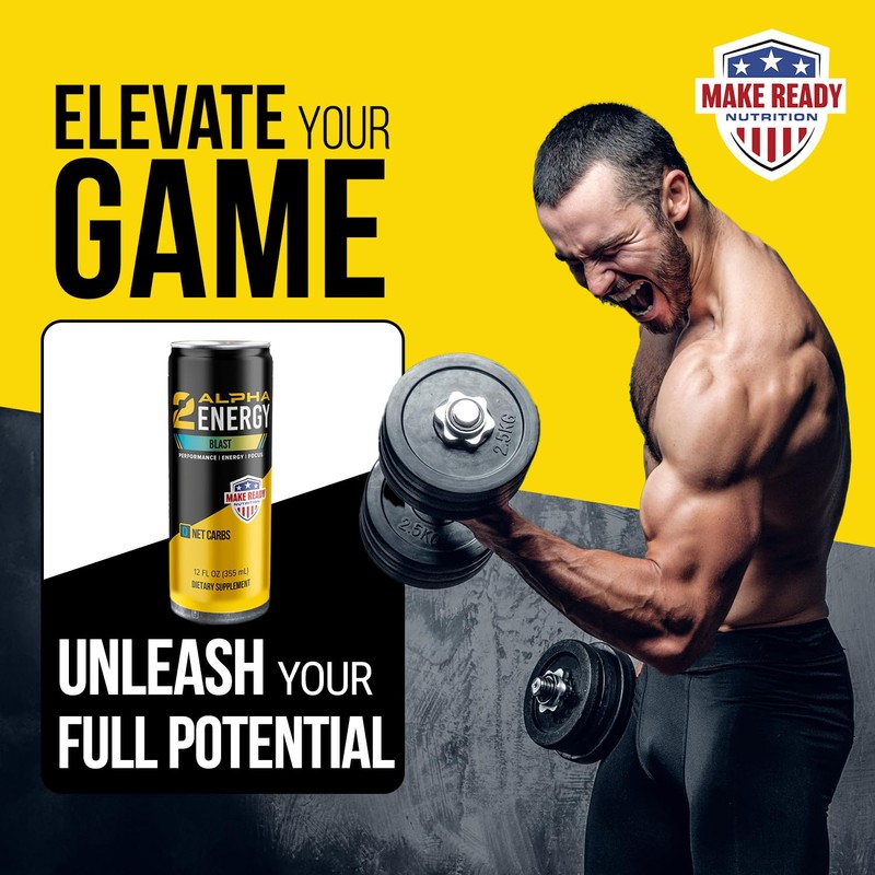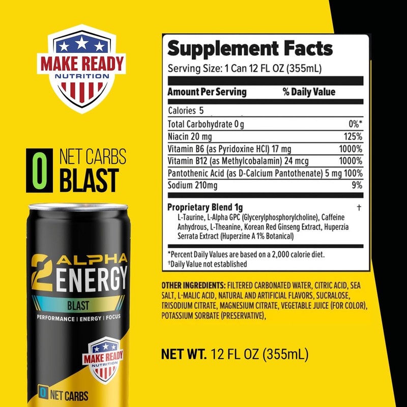 Make Ready Nutrition - 2Alpha Energy Blast - 150mg Caffeine, Alpha-GPC, L-Theanine, Red Korean Ginseng, Zero Sugar, Low Carb - 12 fl oz (12 Pack)