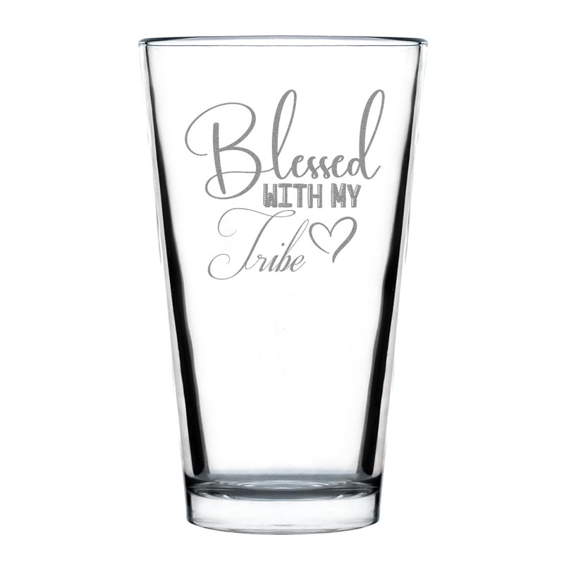 Make Your Mark Design Blessed With My Tribe Pint Glass, Hand Engraved Etched 16oz Standard Glass