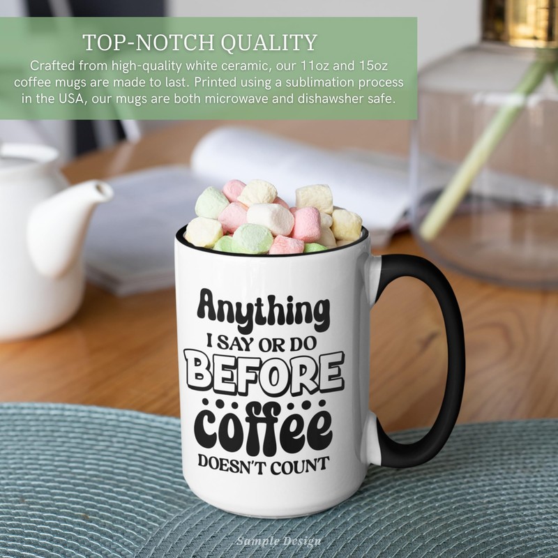 Thoughtfully designed and crafted in the USA, this ceramic mug is safe for both microwave and dishwasher use, making it as convenient as it is fun. Each mug features a bold, full-color sublimation design on both sides, ensuring that your design remains vibrant even with daily use as your design won't fade over time! With a sturdy C-handle for easy grip and a range of accent colors on the handle and inside, this mug delivers a premium look and feel that's perfect for both home and office settings.