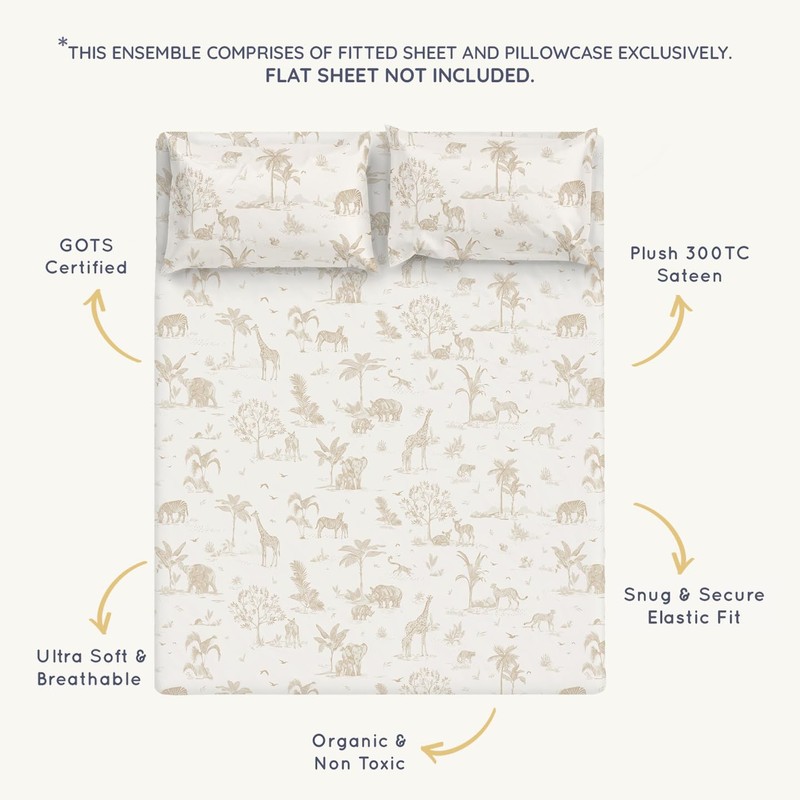 MakeMake Organics Organic Queen Fitted Sheet Set GOTS Certified Organic Cotton Fitted Sheet with Pillowcase Ultra Soft Non Toxic Breathable Hypoallergenic Animals Theme Room (Queen, Safari)
