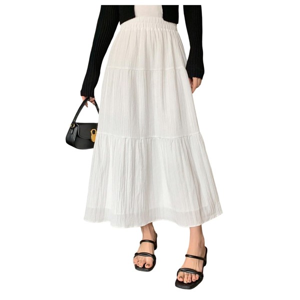MakeMeChic Women's Boho Maxi Skirt Elastic High Waisted Cowboy Chic Pleated A Line Flared Flowy Long Skirts White Small