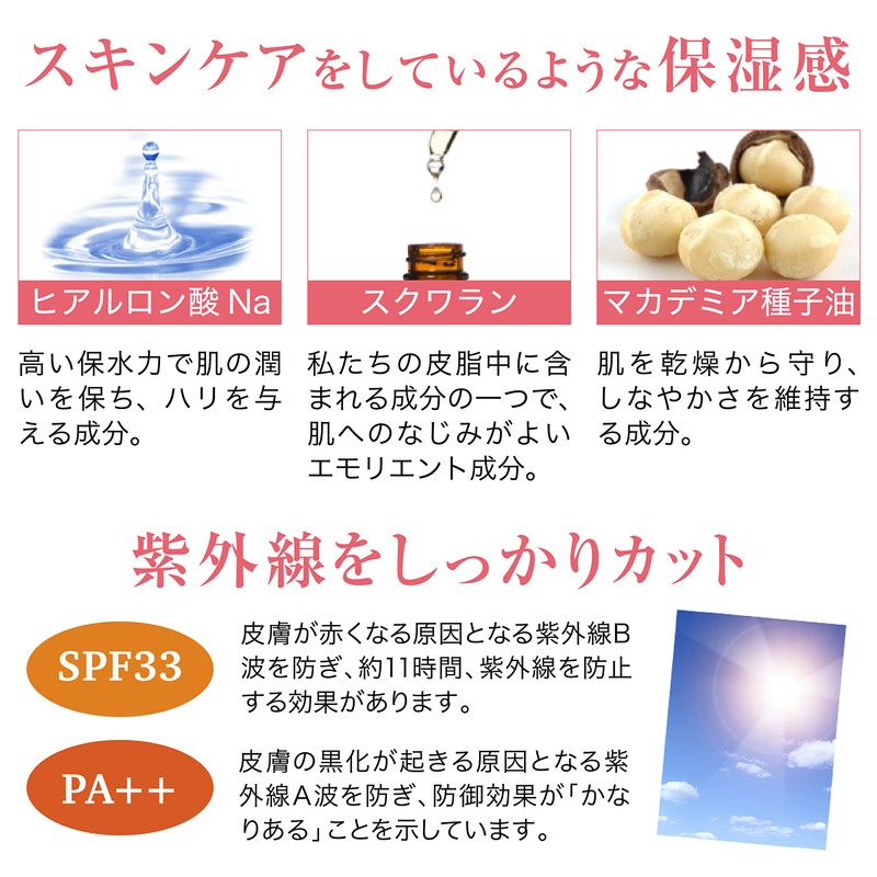 - Moisturizing Feels Like Skin Care: Formulated with sodium hyaluronic acid, squalane, macademia seed oil. It stretches smoothly on your skin to keep you hydrated. (Firmly Blocks UV Rays) SPF33 PA++ protects against UV rays