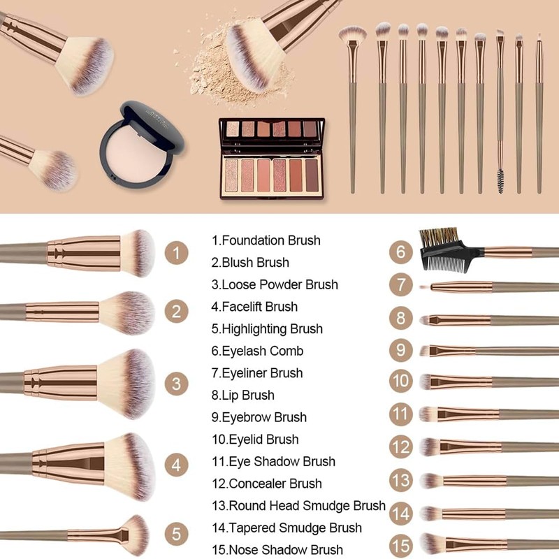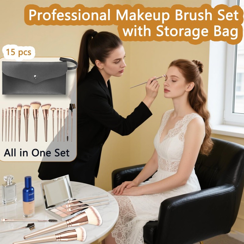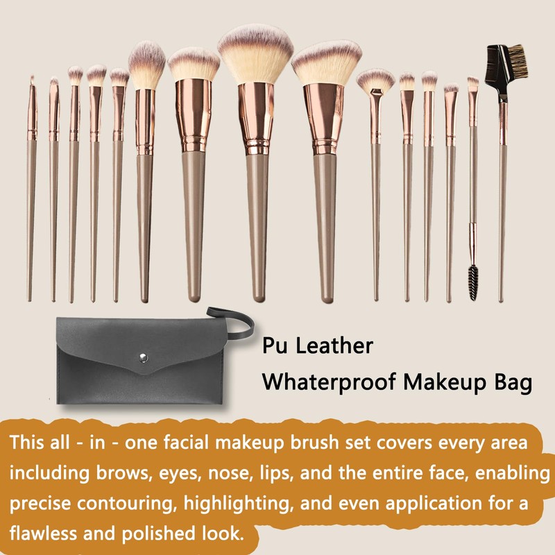 - 【Professional Makeup Brush Set】Unlock the secret to flawless makeup with the 15-piece Professional Makeup Brush Set. Designed for precision, these makeup brushes handle everything from eye shadow and eyeliner to foundation and blush,as well as face details makeup, ensuring a perfect application every time. Whether you're a beginner or a makeup enthusiast, this make up brush set makes it easy to achieve professional-like results. The included Pu leather storage bag keeps your brushes organized and ready for any adventure. Say goodbye to messy makeup and hello to a seamless, radiant look that makes you feel confident and beautiful.