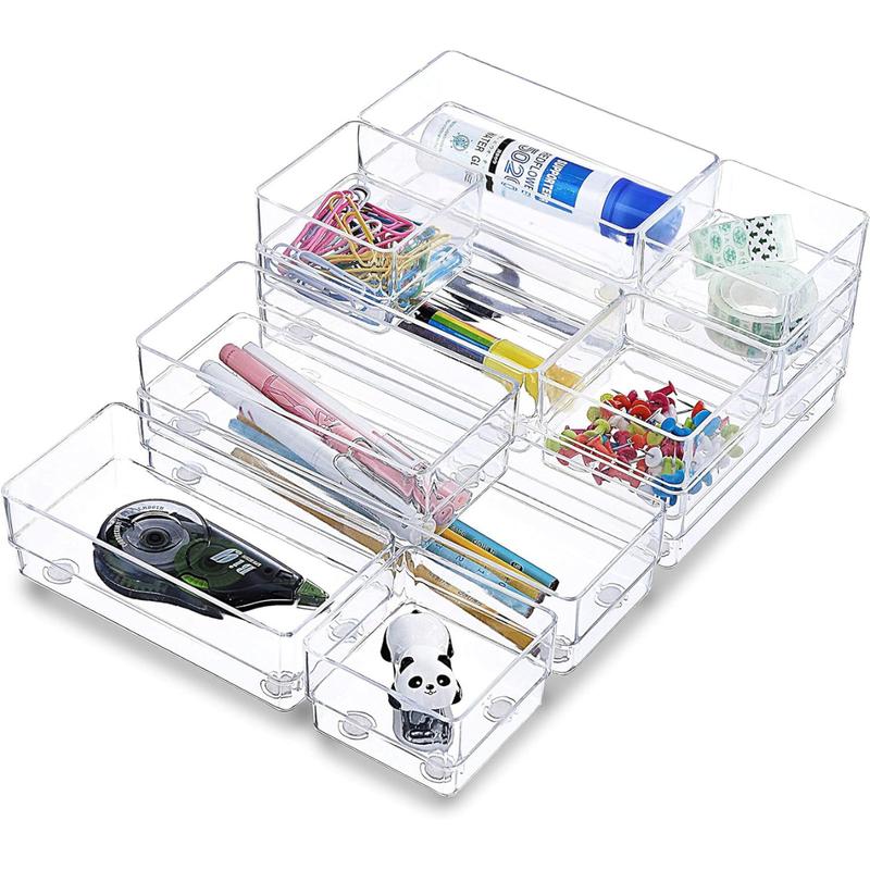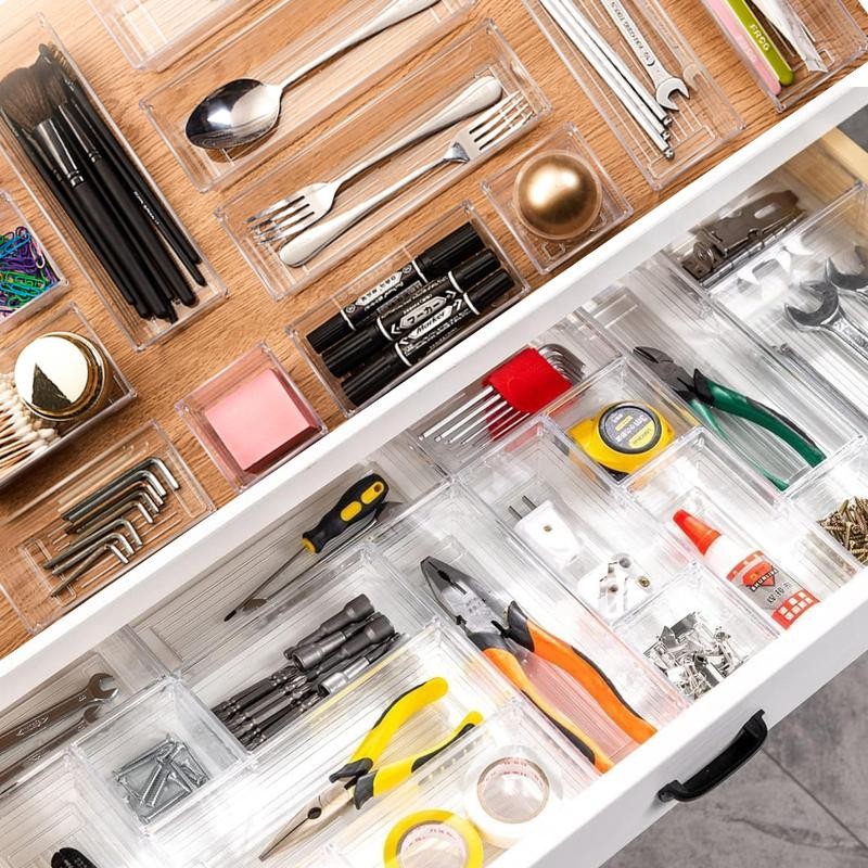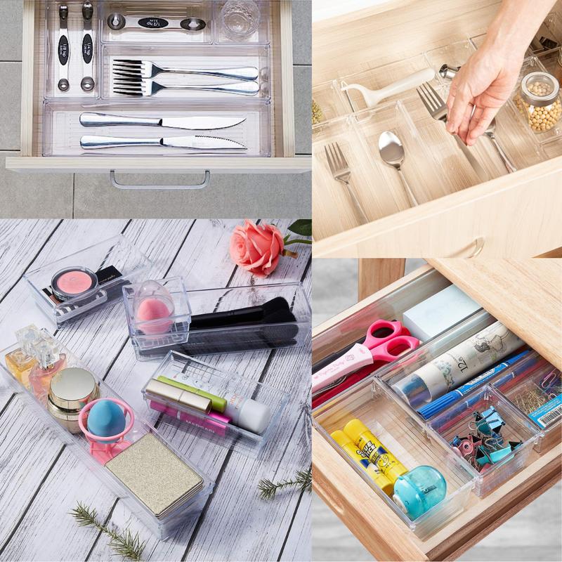 - When you want something but can't find it, it's definitely not a pleasant thing to be in a hurry. Then, our drawer organizer can help you solve all similar troubles. The Clear Plastic Tray can make your home furnishings no longer cluttered and keep your life in order.