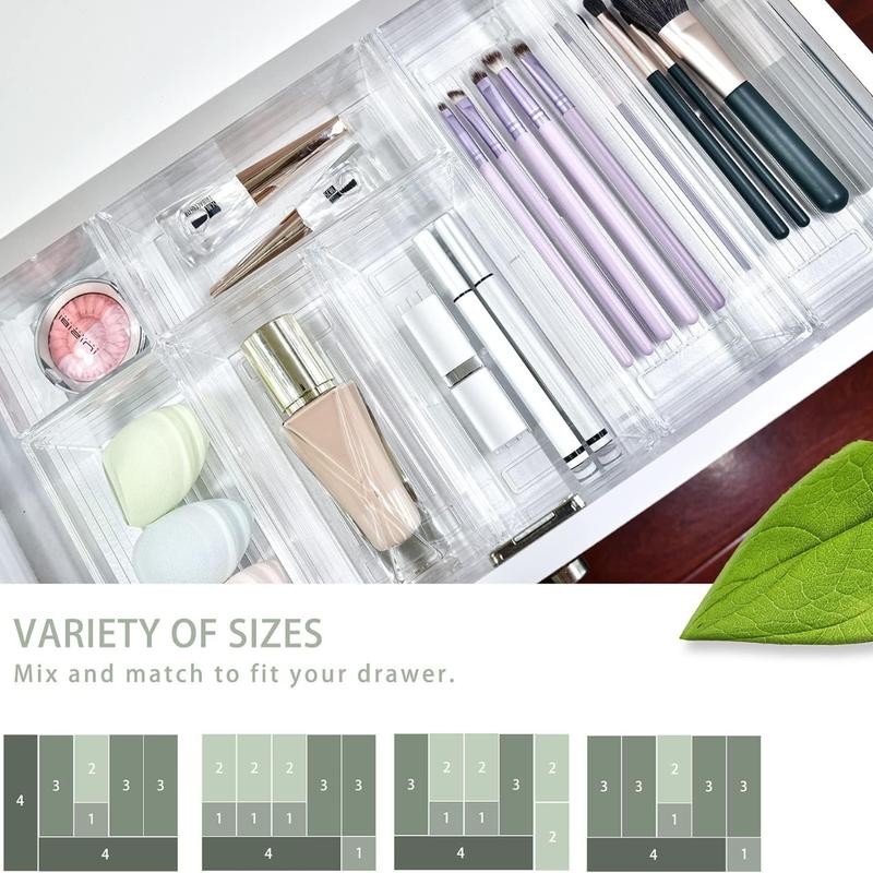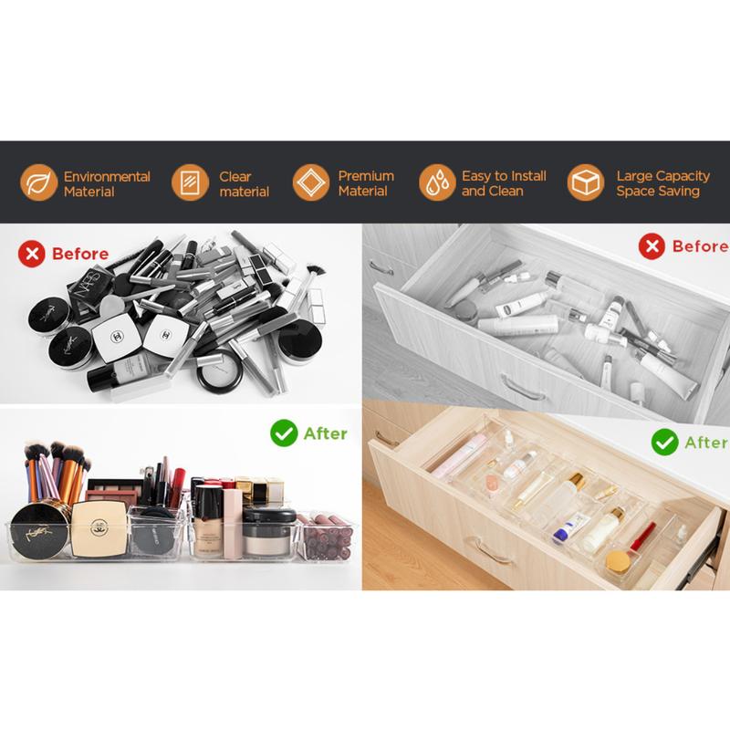 - The Drawer organizer is made of high-quality hard and clear plastic.