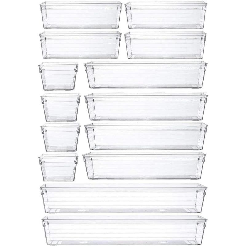 - 14 Pcs Drawer Organizer Storage Trays For Kitchen for Makeup, Bedroom, Office, Desk, Versatile Plastic Clear Drawer Organizer.
