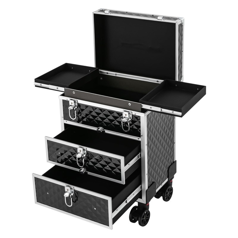 Makeup Rolling Train Case Rolling Nail Case, Professional Manicure Storage Case with Removable Universal Wheels, Cosmetic Organizer Box w/ Drawers&Locks, Large Cosmetic Trolley for Nail Art (Black)