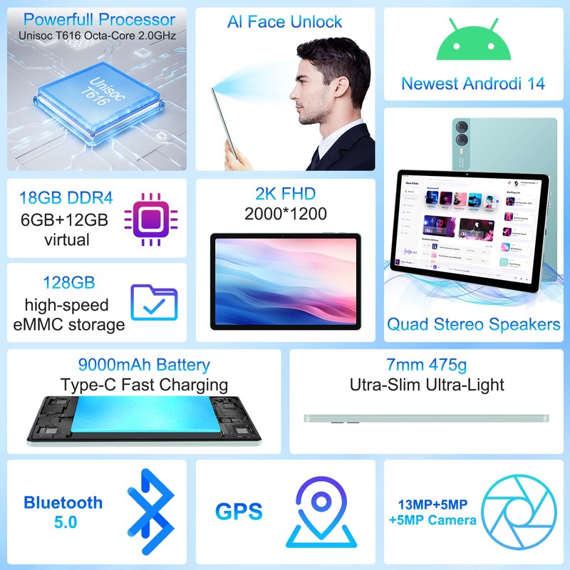 - POWERFUL MEMORY AND EXPANSIVE STORAGE: Equipped with 18GB DDR4 RAM (6GB + 12 GB Virtual). Comes with 128GB high-speed eMMC storage, expandable with a TF card up to 1TB, providing ample storage space for all your needs.