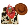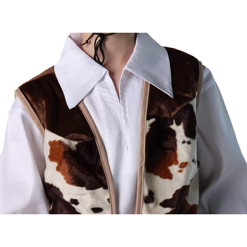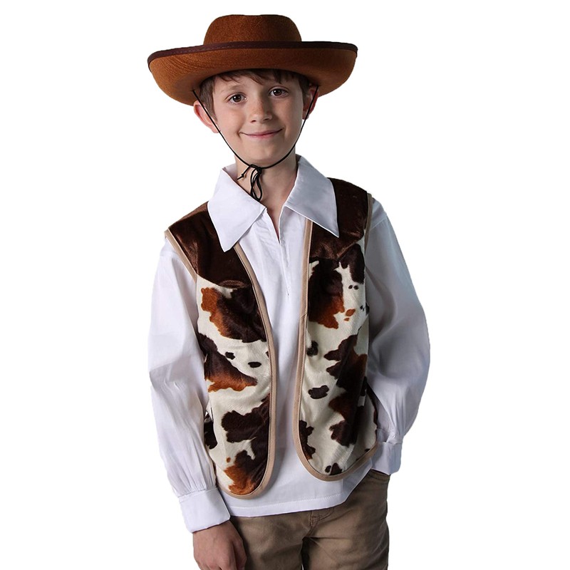 - Dress up set includes one brown cow print western style vest, felt hat and classic red bandana (Note: Brown color may vary slightly.)
