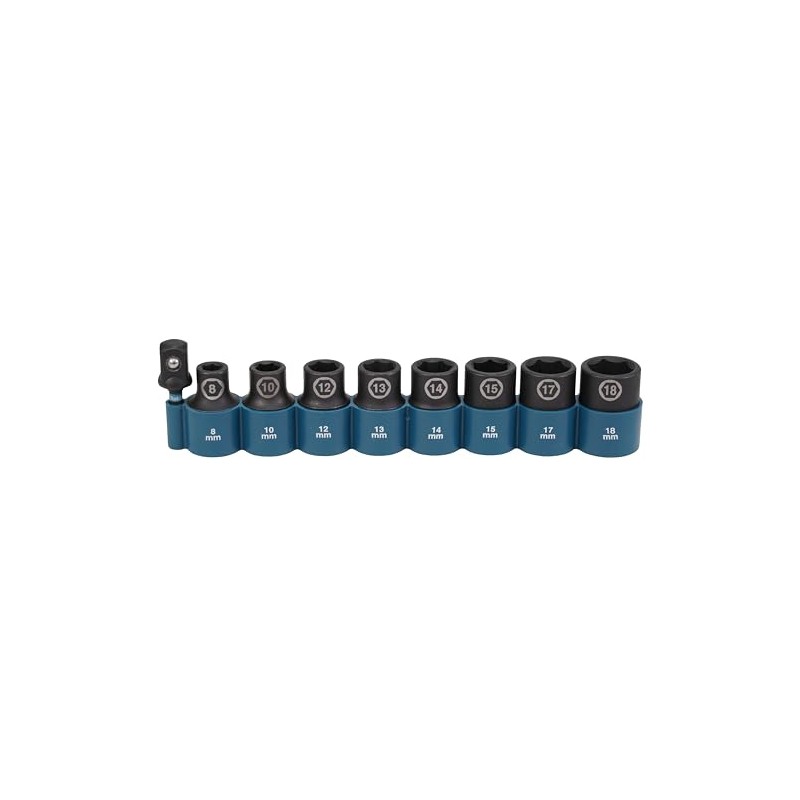 Makita E-16645 Impact Black Impact Socket Set 1/2 Inch 9-Piece SW8 - SW18 with Adaptor 50 mm 1/4 Inch Hex to 1/2 Inch Square, Chrome-Molybdenum, Impact Sockets 38 mm Long
