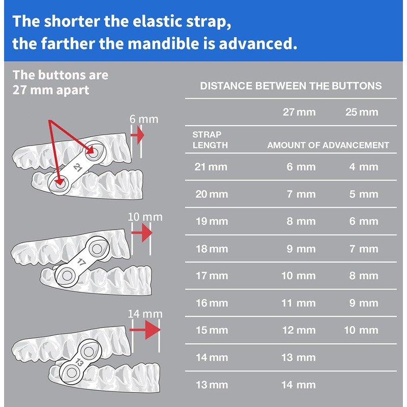 - 9 LengthsThere are 13mm, 14mm, 15mm, 16mm, 16mm, 17mm, 18mm, 19mm, 20mm, 21mm, 21mm for choice. The shorter the elastic strap, the farther the mandibleis advanced. You should replace the straps whenever the holes in the straps are oval or when the existing strap is 1/8 inch longer than a new strap.