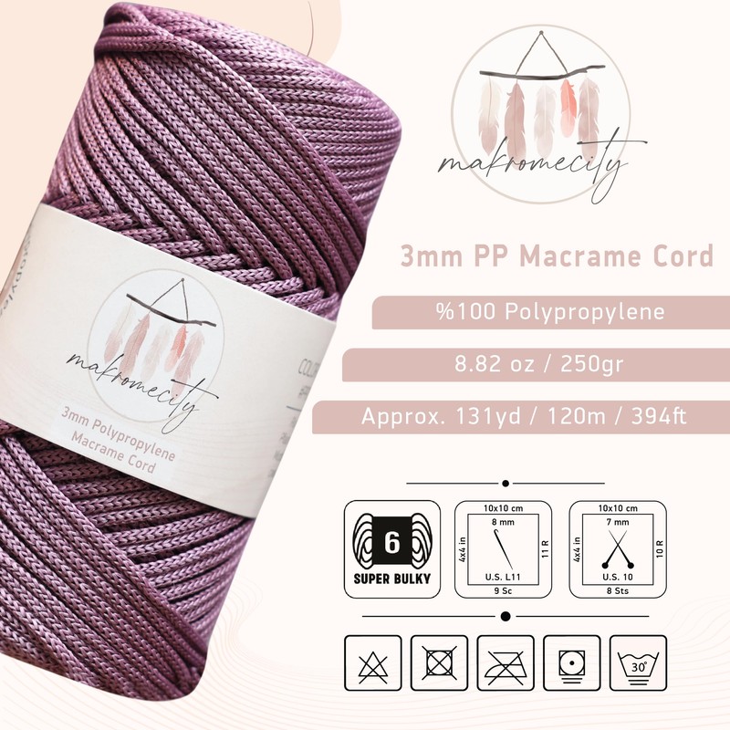 - Polyester Macrame Cord - Made of Polypropylene. Size of the cord is 3 mm. Each strand of a polyester macrame cord is 250g. The length of each roll is 120 metres (131 yards). This means our cord is long enough to make perfect macrame projects.