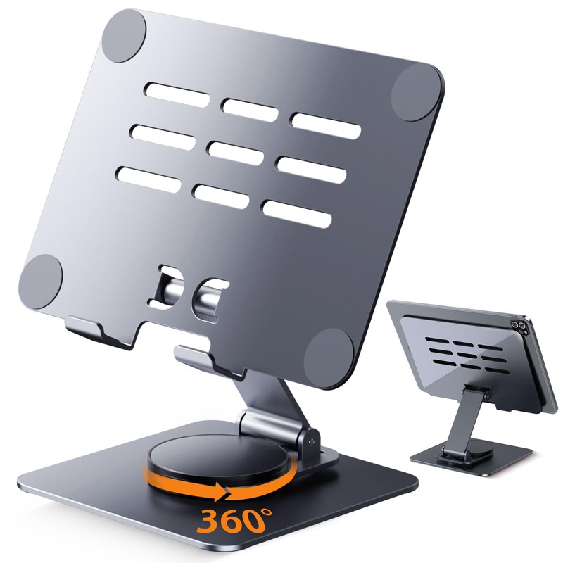 - Folding 360° Stepless Adjustment, Height and Angle Freely: The AR swivel axis allows for unlimited rotation. High precision gears for smooth rotation. With its ergonomic design, when the tablet stand matches people's sights, it will correct posture, stretch your back muscles, reduce the burden on your neck and shoulders, effectively alleviate back pain even when working on a desktop for a long time