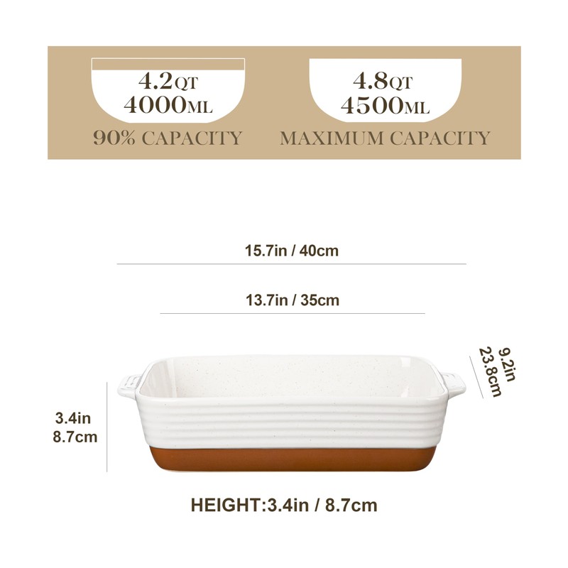 - 【Generous Capacity & Deep Design】 Measuring 13.7x9.2x3.4 inches with a 4.8-quart capacity, this baking dish is perfect for cooking large portions. The deep design allows you to bake layered dishes or hearty meals with ease.