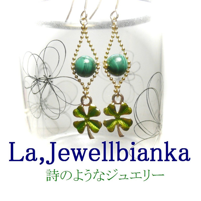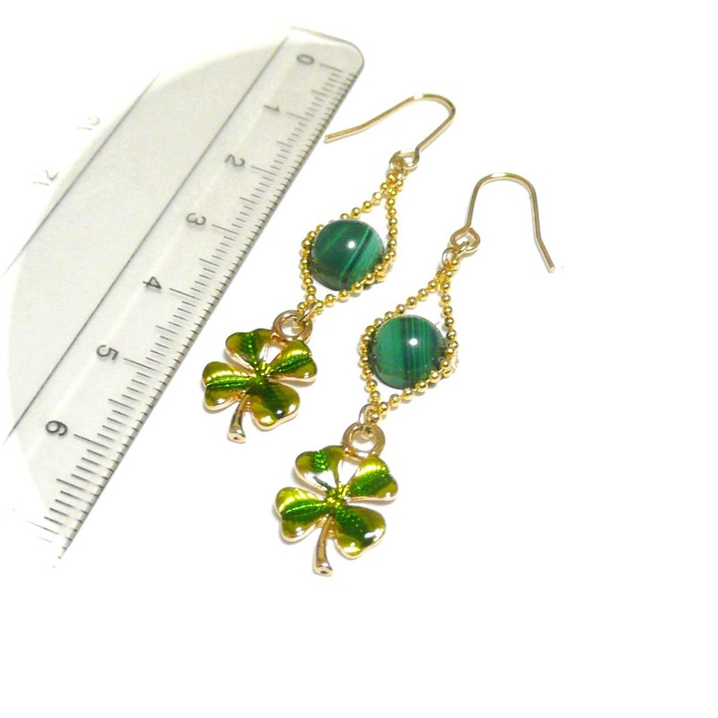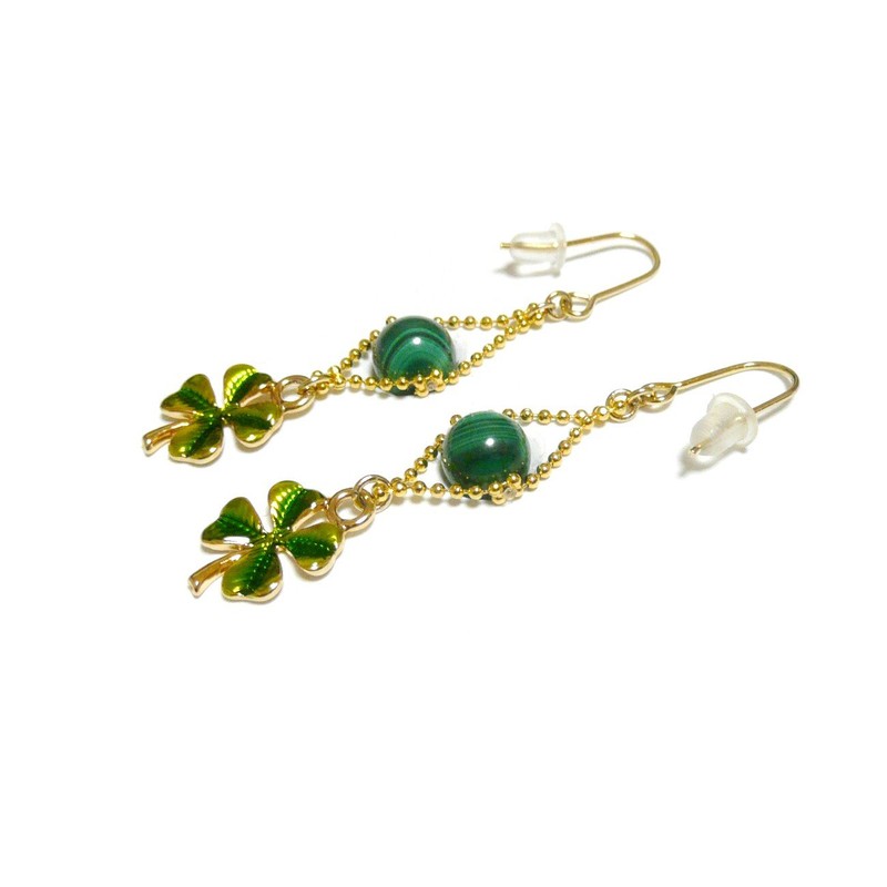 Malachite and Quatrefoil Clover Earrings in Gold Tone, Gemstones, Malachite