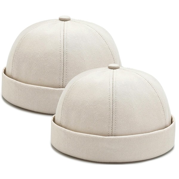 Malaxlx 2 Pcs Mens Beige Brimless Docker Cap Skull Cap Worker Sailor Cap Rolled Cuff Retro Beanie