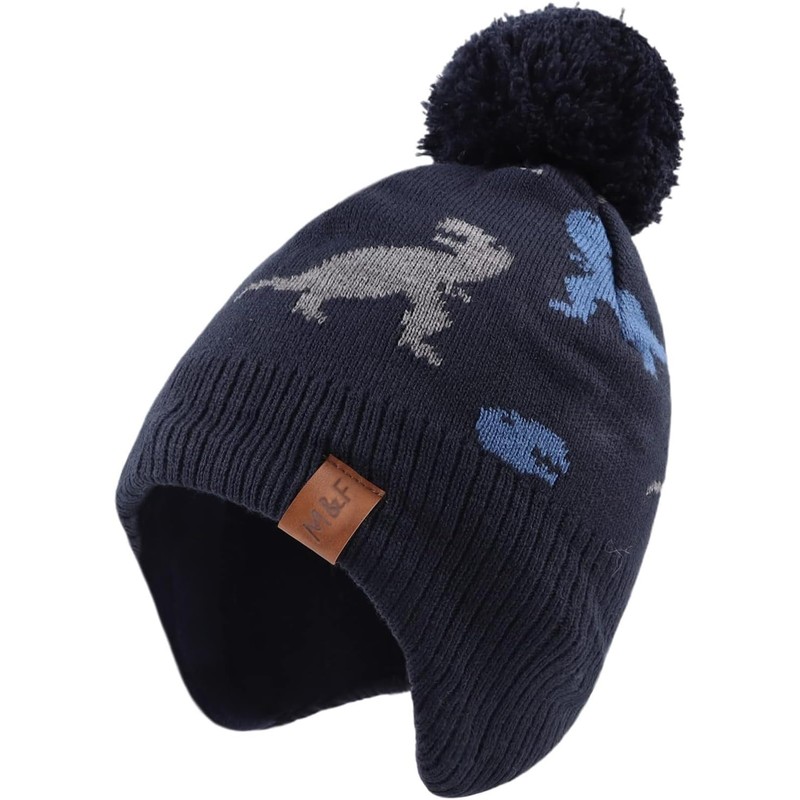 Malaxlx Kids Dinosaur Navy Blue Pom Pom Beanie Hat Winter Warm Child Knitted Earflap Hat Fleece Lined Ski Skull Cap for 4-8 Years Boys Girls