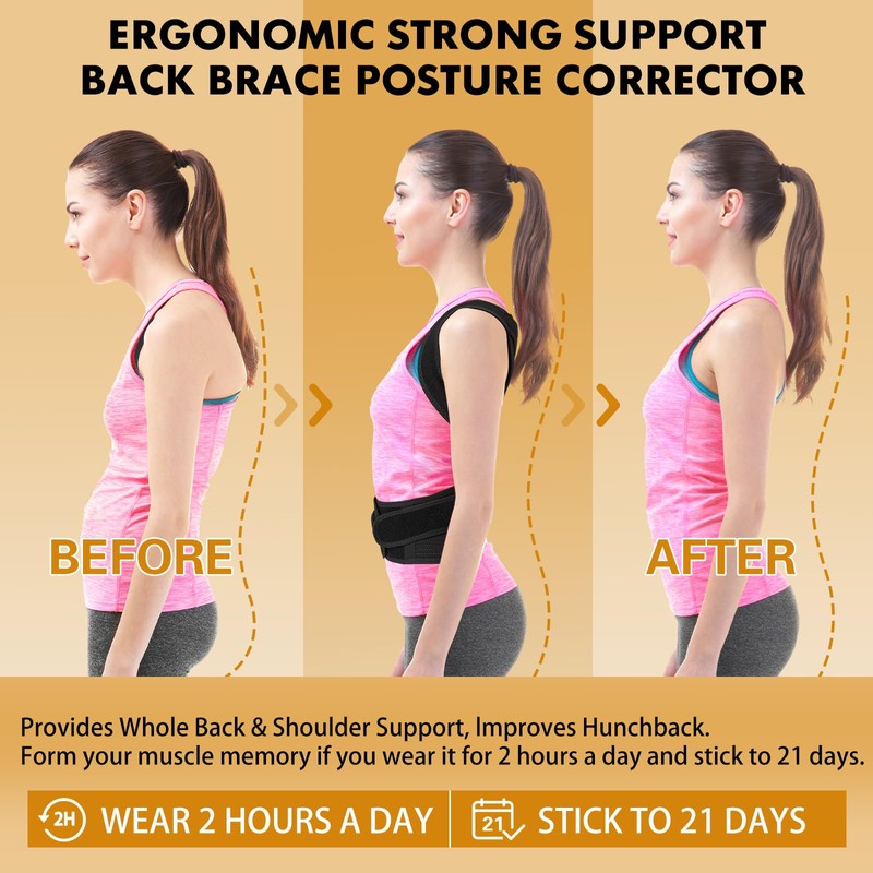 - 【Newer and Better】In the new version, our back brace equips with High-elastic support strip that provides stable support. Withdrawable support strip makes you conveniently regulate the pressure or clean the posture corrector. Newly added storage bag can store keys, mobile phones, credit cards and other items.