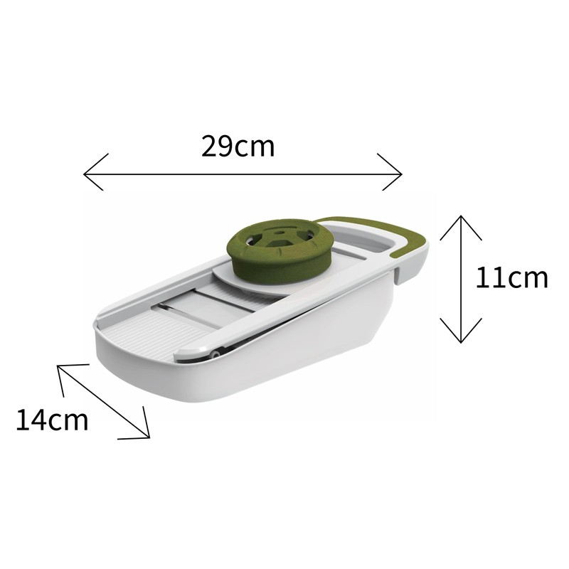 • The vegetable slicer comes with 4 stainless steel blades in different shapes: slicer, grater, shredding/chopping/fine slicing and coarse shredding/chopping/chopping.