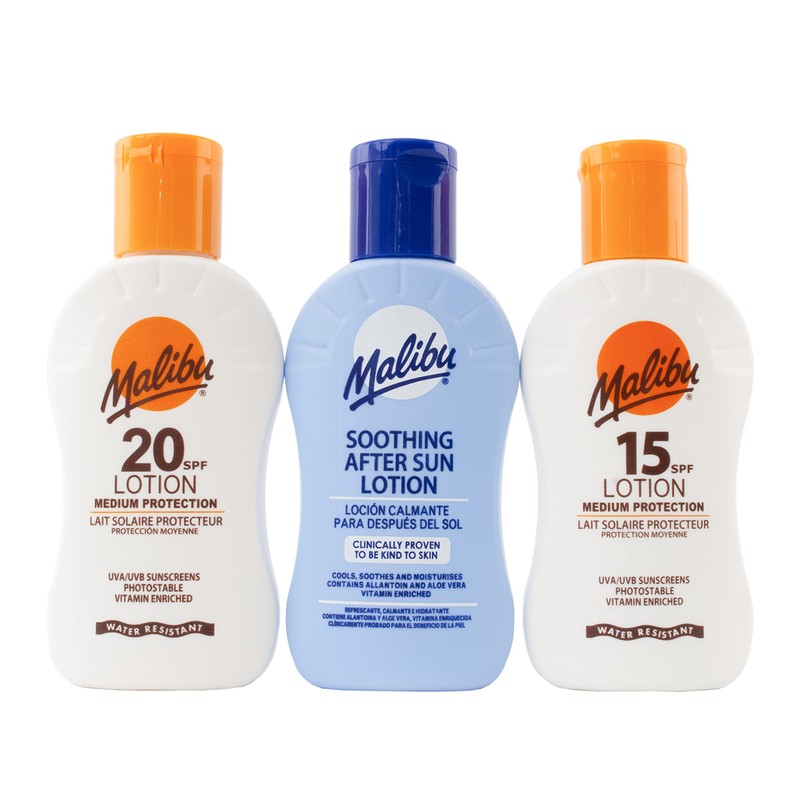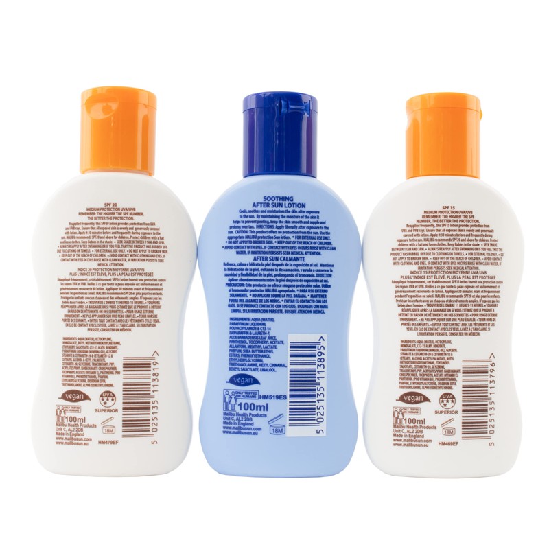 MALIBU Travel set pack 1 x 100 ml sun lotion SPF15, 1 x 100 ml SPF20 and 1 x 100 ml after sun 100 ml cream