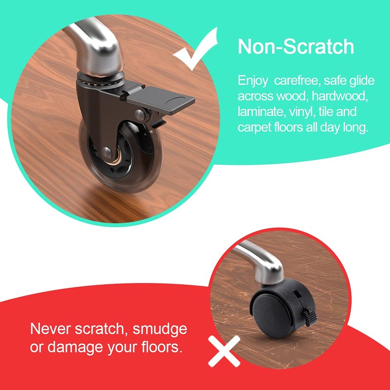 - 【SILENT & Easy Rolling & Safe For Any Floors】--Our replacement chair casters encased by soft & durable Polyurethane,safe for any floor,glide across any surface without markings,scratches;precision bearings on both side,ensure rolling with ease;do not allow the cheap plastic wheels to damage your hardwood floor any more,replace with these Modern Stylish castor wheels to enjoy smooth,silent rolling experiences;